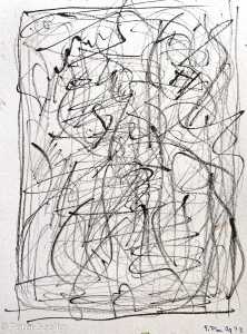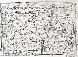 Both pieces share an unfocused and focused crossover of tracery fragments of a deep language (beyond or before the formation) of words and gestures overlapping and made visible simultaneously on one surface.